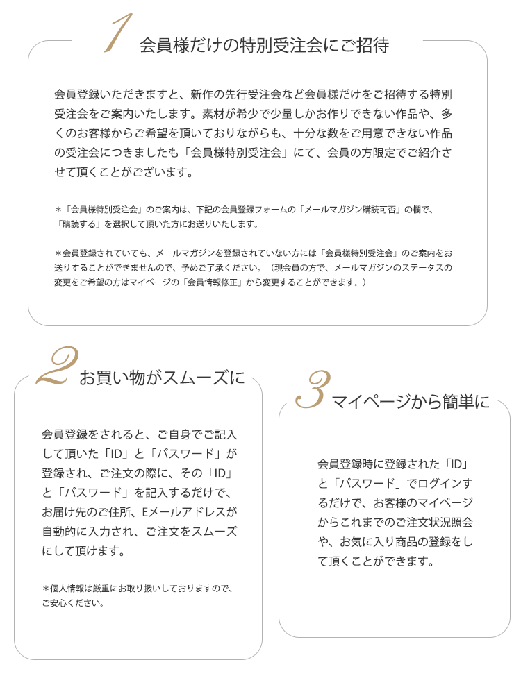 ALAYA公式オンラインショップでは、会員様を随時募集いたしております。 「ALAYA公式オンラインショップ会員」とは、メルマガ購読の登録とは別に、こちらのページから会員登録をして頂いたお客様のことです。 会員にご登録頂きますと、便利で楽しくお買い物いただけます。(入会費・年会費は無料です。 ) 会員特典は【メルマガ購読のご登録のみのお客様】には適用されませんので、ご注意下さいませ。